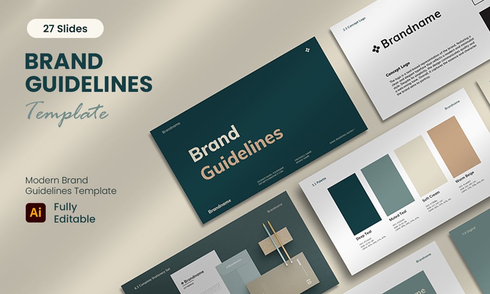 A clean and modern Brand Guidelines template β€” 27 fully editable AI slides to help you present logo, typography, colors, and more. Perfect for designers who want to deliver brand identity with confidence.